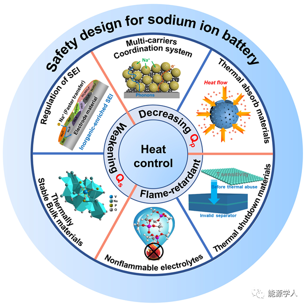 近期,武漢理工大學(xué)麥立強教授(通訊作者)和尤雅教授(通訊作者)從材料層面總結(jié)與分析了電池中主要產(chǎn)熱來源,熱失控過程引起的化學(xué)反應(yīng)、衡量電池安全性的重要參數(shù),并討論了為降低熱效應(yīng)電極材料的設(shè)計準則。第一作者為武漢理工大學(xué)博士研究生楊超。文章主要圍繞減少電池內(nèi)部極化熱(Qp)和副反應(yīng)熱(Qs)、加快熱傳遞速率、阻燃和功能性熱保護材料做了詳細探討。該文重點關(guān)注電池的熱行為,并提出一些潛在可行的策略,這將加深對SIBs熱失控的了解,并加速熱安全體系電池材料的設(shè)計。該工作發(fā)表于材料領(lǐng)域期刊Advanced Energy Materials,題為“Materials Design for High-Safety Sodium-Ion Battery”。