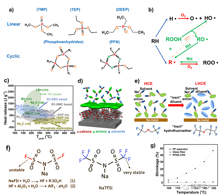 圖5 a)幾種代表性有機磷酸鹽的化學(xué)結(jié)構(gòu)。b)有機磷的阻燃機理。c)在PC-/EC-DEC-/EC-DMC電解液和磷酸鹽電解液(NTP: NaTi2(PO4)3;NVP:NaV2(PO4)3)中各種電極材料的放熱溫度和總熱量。d)陽離子在阻燃的高濃電解液中插入碳質(zhì)負極的行為。e)從HCE到LHCE的稀釋過程示意圖,以及氫氟醚的代表性化學(xué)結(jié)構(gòu)。f)NaFSI(左)和NaTFSI(右)的化學(xué)結(jié)構(gòu)。(g)聚丙烯分離器、玻璃纖維和PPDE-CPE的熱收縮率為100至150 °C。