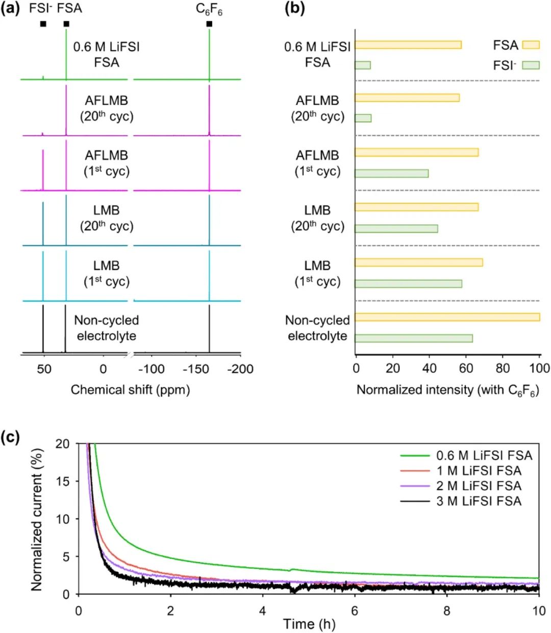 圖3. (a) 0.6 M LiFSI FSA 電解質(zhì)、非循環(huán)電解質(zhì)、AFLMB 和 LMB 與 3 M LiFSI FSA 電解質(zhì)經(jīng)過(guò) 1 個(gè)和 20 個(gè)循環(huán)后的 19F NMR 光譜。(b) 19F NMR 光譜中 FSI 陰離子和 FSA 溶劑峰的綜合面積,使用 (a) 19F NMR 光譜中 C6F6 的內(nèi)部參考進(jìn)行歸一化。(c) Cu/NCM811 電池在 25 °C預(yù)循環(huán)后,在 4.25 V 下進(jìn)行的電化學(xué)浮動(dòng)測(cè)試。