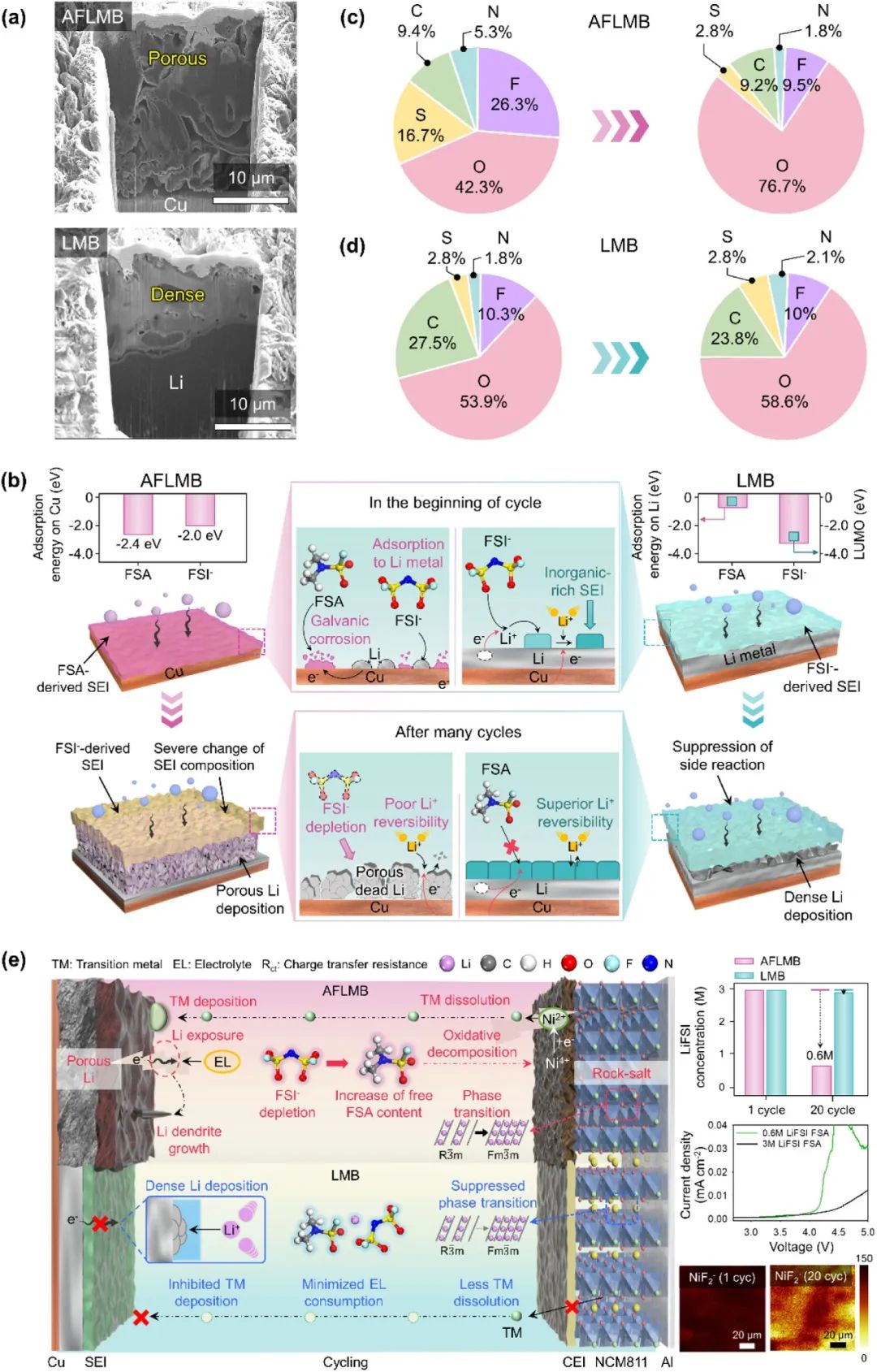 圖1. (a) 銅箔和鋰金屬陽(yáng)極鍍鋰后的截面 SEM 圖。(b) 根據(jù)最低未占分子軌道(LUMO)能級(jí)以及 FSA 溶劑和 FSI-陰離子在 Cu 和鋰金屬上的吸附傾向的結(jié)果,Cu 銅箔和鋰金屬陽(yáng)極在第一個(gè)周期鍍鋰前后 SEI 成分的變化示意圖。XPS 分析得出的原子百分比:(c) AFLMB 中的銅箔和 (d) LMB 中的鋰金屬陽(yáng)極,在 AFLMB 首次充電期間,鍍鋰前充電至 3.7 V 和鍍鋰后充電至 4.25 V 時(shí)的對(duì)比。(e)通過(guò)比較分析(循環(huán)過(guò)程中 LiFSI 濃度的變化、LSV 和 TOF-SIMS 圖像)發(fā)現(xiàn),使用 3 M LiFSI FSA 電解液的 AFLMB 和 LMB 的界面現(xiàn)象存在差異。