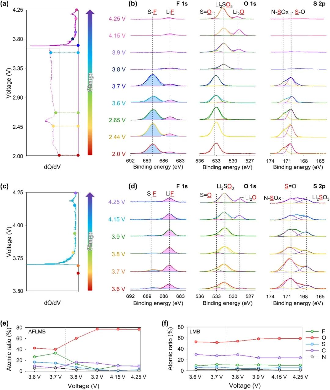 圖4. (a) C/10 預(yù)循環(huán)充電期間 AFLMB 的 dQ/dV 圖。插圖表示與 SEI 形成相對(duì)應(yīng)的 dQ/dV 峰放大區(qū)域。(b) AFLMB 中的銅箔在不同帶電狀態(tài)下的 F 1s、O 1s 和 S 2p XPS 結(jié)果。(c) C/10 預(yù)循環(huán)充電期間 LMB 的 dQ/dV 曲線。(d) LMB 中的鋰金屬陽(yáng)極在不同充電狀態(tài)下的 F 1s、O 1s 和 S 2p XPS 結(jié)果。XPS 分析得出的 (e) 從 AFLMB 中提取的銅箔和 (f) 從 LMB 中提取的鋰金屬陽(yáng)極在不同帶電狀態(tài)下的界面層原子比。