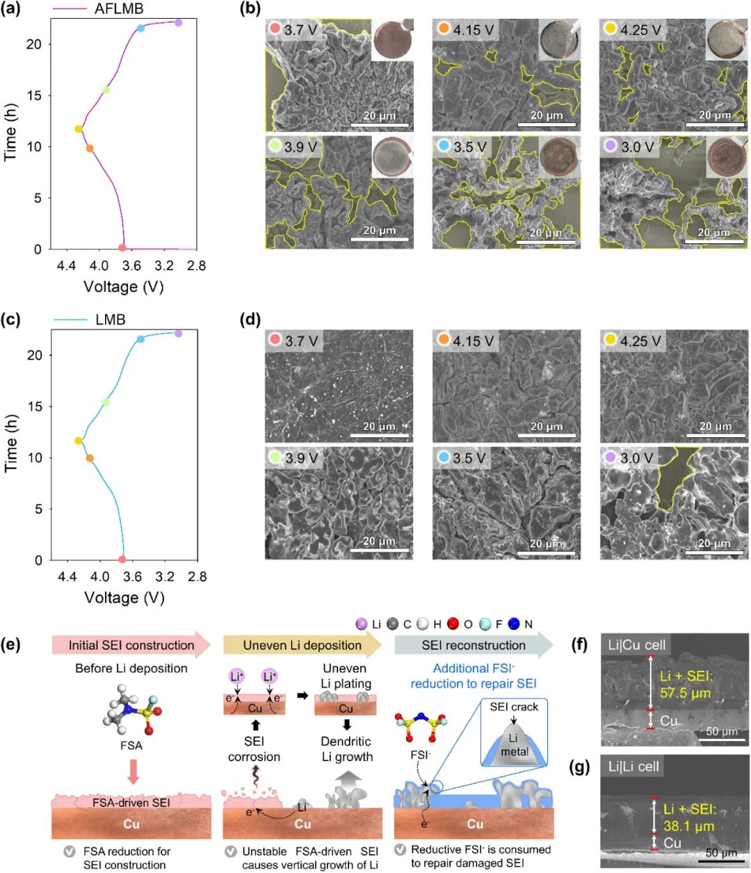 圖5. (a) AFLMB 在 C/10 和 25 °C 預(yù)循環(huán)期間的電壓曲線。(b) 與(a)AFLMB 電壓曲線相對(duì)應(yīng)的銅基板上沉積鋰金屬的表面 SEM 圖像。(c) LMB 在 C/10 和 25 °C 預(yù)循環(huán)期間的電壓曲線。(d) 與(c)LMB 電壓曲線相對(duì)應(yīng)的鋰金屬陽(yáng)極表面 SEM 圖像。(e) 銅基板上的鋰鍍層示意圖。(f)鋰/銅電池和(g)鋰/鋰電池在 1 mA cm-2 和 2 mAh cm-2 初始鋰電鍍后提取的沉積鋰金屬陽(yáng)極的截面 SEM 圖像。