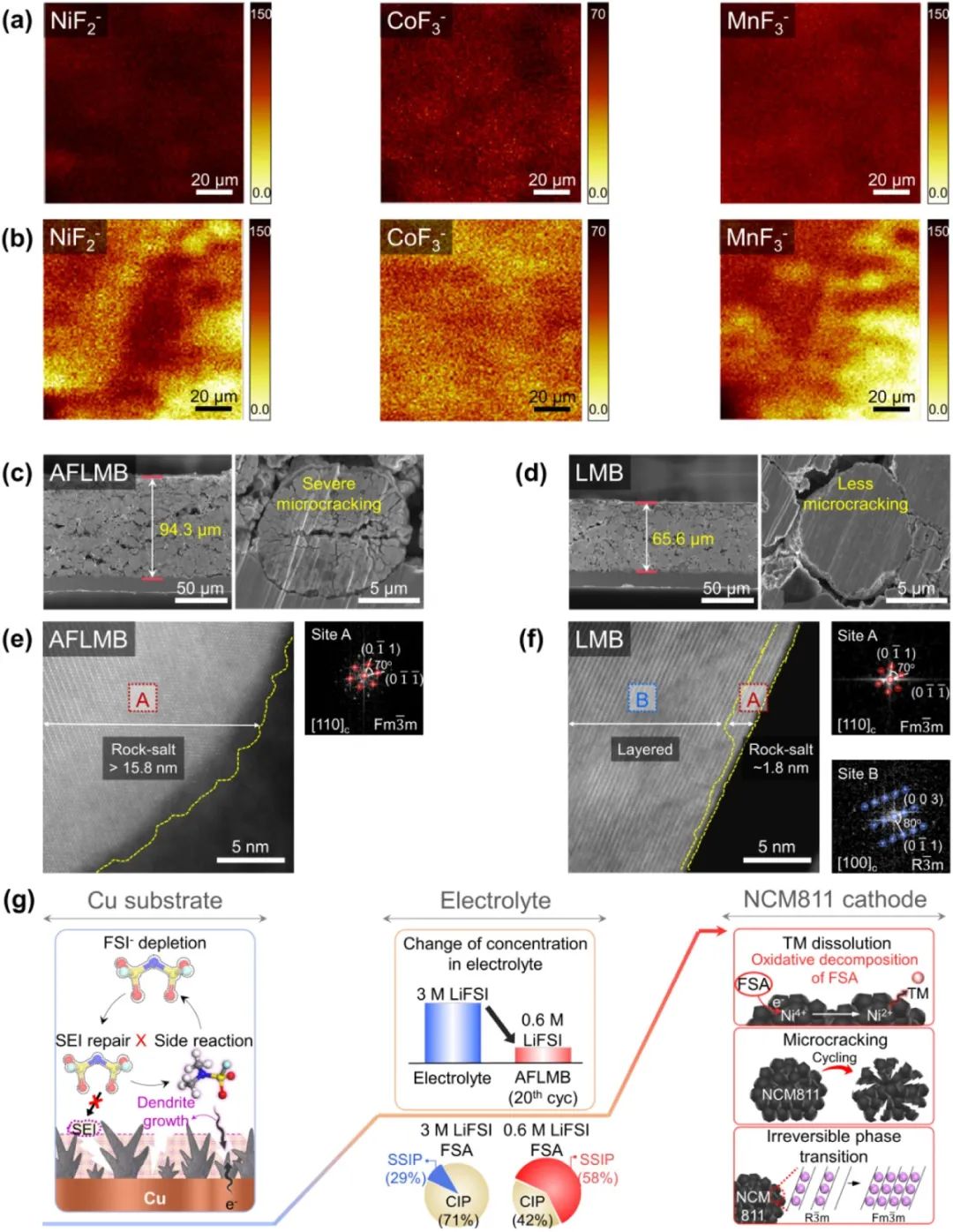 圖7. 在 C/3 和 25 ℃ 下分別經(jīng)過(guò) (a) 20 次和 (b) 100 次循環(huán)后,AFLMB 中銅上的 NiF2-、CoF3- 和 MnF3-的 TOF-SIMS 化學(xué)圖譜。在 C/3 和 25 °C 下循環(huán) 100 次后,從 (c) AFLMB 和 (d) LMB 中提取的 NCM811 陰極的截面 SEM 圖像。在 C/3 和 25 °C 下循環(huán) 100 次后,從含有 3 M LiFSI FSA 電解液的 (e) AFLMB 和 (f) LMB 中提取的 NCM811 陰極的 STEM 圖像和 FFT 圖樣。(g) FSI 陰離子耗竭和 SEI 降解對(duì) NCM811 陰極的交叉影響。